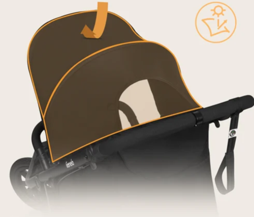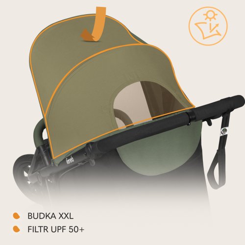 Sluneční stříška XXL: Velkorysá nepromokavá XXL stříška s přídavným panelem na zip je vybavena filtrem UPF50+ a vodoodpudivou vrstvou chránící před deštěm. Magnetická stříška s průzorem umožňuje mít dítě neustále na očích. Součástí sady je také funkční ochranná fólie proti dešti.