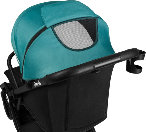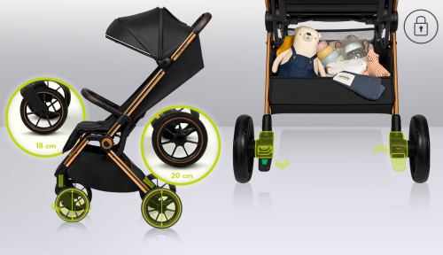 bezúdržbová kola z pěny EVA s tlumiči nárazů z PU, otočná přední kola o 360°, nastavitelné opěradlo až do ležící polohy, nastavitelná nepromokavá XXL stříška s filtrem UPF50+ a s okýnkem, reflexní prvky, 5ti bodové bezpečnostní pásy, opěrka na nohy z ekokůže, systém click+amp;ride umožňuje rodičům dělat dlouhé kroky a nožní brzda zaručí bezpečné zastavení, nákupní koš s maximální nosností 3kg, držák na nápoje, nánožník, automatické skládání po stisknutí tlačítka, speciální potah a pás na přenášení složeného kočárku.