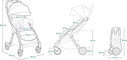 Rozměry sestaveného kočárku: 50 x 75 x 101 cm Rozměry složeného kočárku: 60 x 50 x 27 cm Nosnost: 22 kg Hmotnost kočárku: 6,6 kg Výrobek splňuje požadavky Evropské bezpečnostní normy EN 1888.