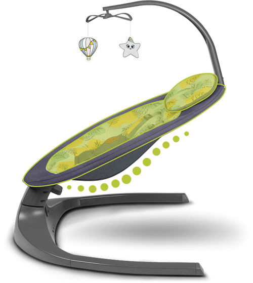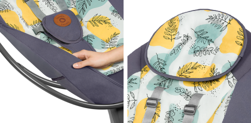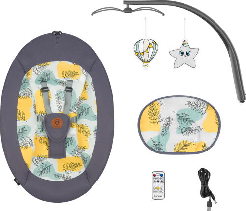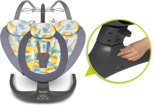 profilované sedadlo s měkkým polštářkem nízká hmotnost = snadné přenášení nastavení sklonu opěradla do 2 poloh automatická detekce pohybu 5 rychlostí houpání vestavěný časovač na 8,15 nebo 30 minut přehrávání 12 melodií, ovládání hlasitosti ovládání pomocí dotykového panelu nebo dálkového ovladače 2 způsoby napájení: baterie nebo ze sítě pomocí přes USB kabel (součástí balení 1,2m) pro provoz je třeba 4 ks 1,5V baterie AA,LR6 (nejsou součástí balení) odnímatelná hrazdička se 2 hračkami snímatelný potah lze prát v pračce max na 30°C 5-bodové bezpečnostní pásy protiskluzové kryty - chrání podlahu proti poškrábání.