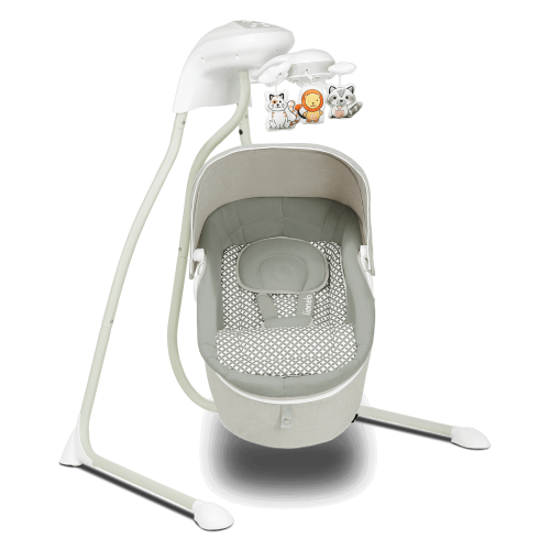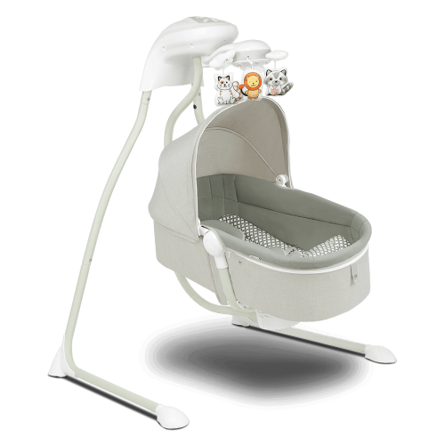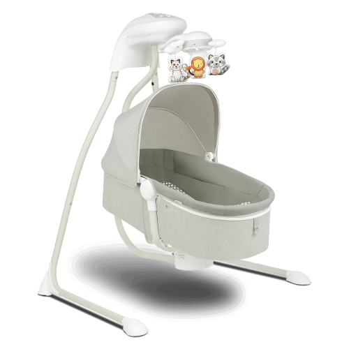 Pevný a stabilní ocelový rám, 3 nastavitelné polohy houpátka - z ležící do sedící, tiché houpání, otočení korbičky houpátka až o 115°, měkká vložka a odnímatelné polstrování (lze prát ručně), 5ti-bodové bezpečnostní pásy, kolotoč s hračkami a světýlky, MP3 přehrávač s 12 melodiemi a zvuky přírody včetně USB, časovač houpání, napájení 2 způsoby: přiloženým napájecím zdrojem nebo 4 bateriemi D+ R20 1,5 V (baterie nejsou součástí výrobku), moskytiéra.