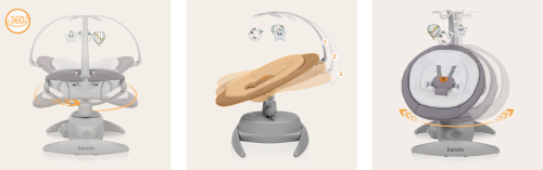 určeno pro děti od narození do doby, než dosáhnou hmotnosti 9 kg nebo zvládnou samostatně sedět široké, vhodně tvarované lehátko zajišťuje pohodlnou a bezpečnou polohu dítěte 5 stupně nastavení rychlosti houpání 5 bodové bezpečnostní pásy s polstrováním v rozkroku ovládací panel je ve střední části základny přehrávání 14 melodií (12 melodií + 2 zvuky přírody) ovládání prostřednictvím přiloženého ovladače bluetooth připojení k přehrání hudby dle vlastního výběru napájení 2 způsoby: 4 ks 1,5V baterie AA (nejsou součástí balení) nebo USB kabel (součástí balení - používejte se síťovým adaptérem 5,8V DC 0,8A) odnímatelná hrazdička s hračkami maximální nosnost 9 kg lze prát ručně jemným pracím prostředkem při max teplotě 30°C