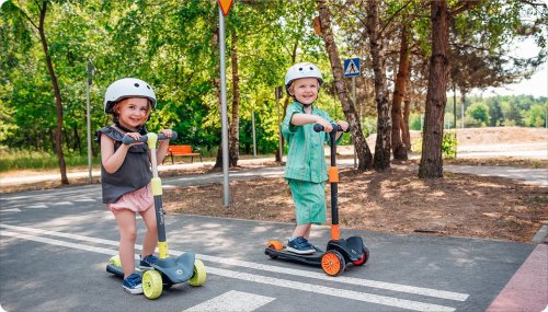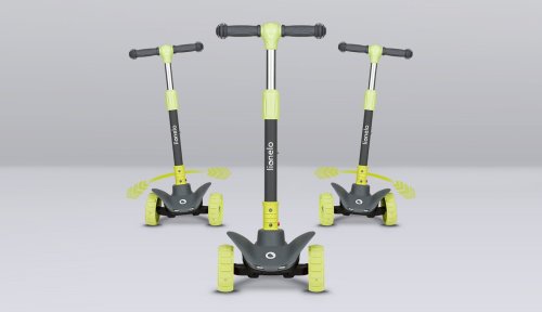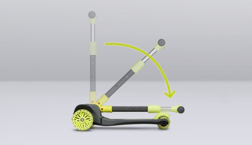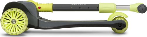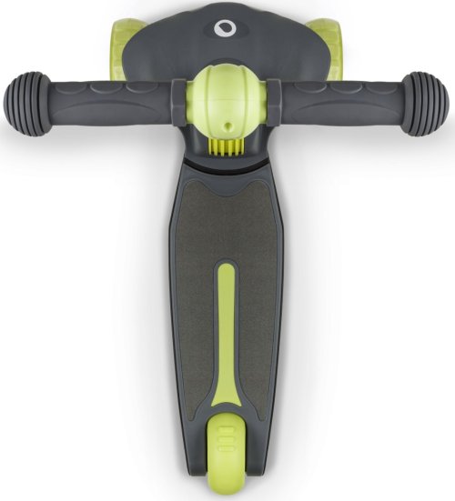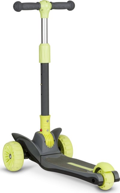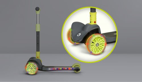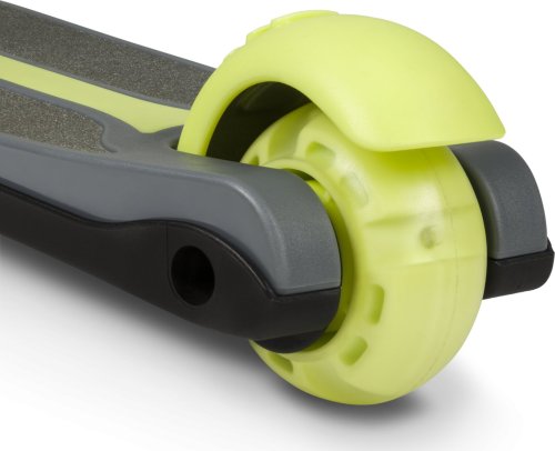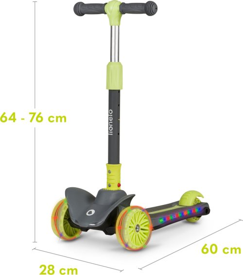 tříkolová pro lepší stabilitu ergonomický tvar 4stupňové nastavení výšky řídítek (64,68,72,76) plošina s protiskluzovou úpravou brzda integrovaná do zadní nápravy přední kola: 12" zadní kolo: 8" ložiska: ABEC-7 veselé barvy LED světla v kolečkách napájená při pohybu LED světla v plošině napájená bateriemi vhodné pro domácí i venkovní použití