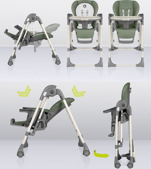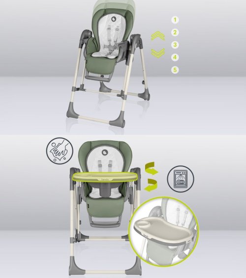 5 úrovní nastavení sedadla 3 úrovně nastavení nánožníku a zádové opěrky 3 rychlosti kolébání a funkce rozpoznání dětského pohybu, po kterém se aktivuje kolébání na 15 minut 5bodový bezpečnostní pás 8 melodií polstrování lze sejmout a ručně vyprat jídelní tác je vhodný do myčky nádobí