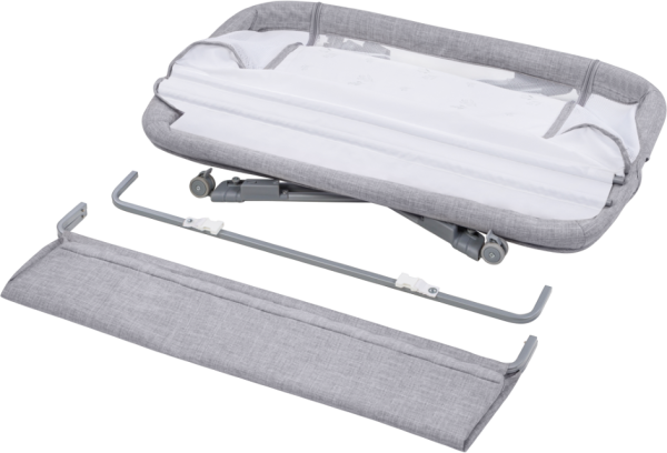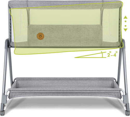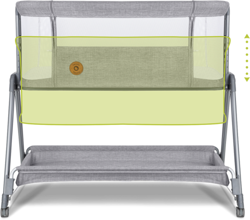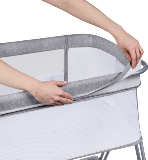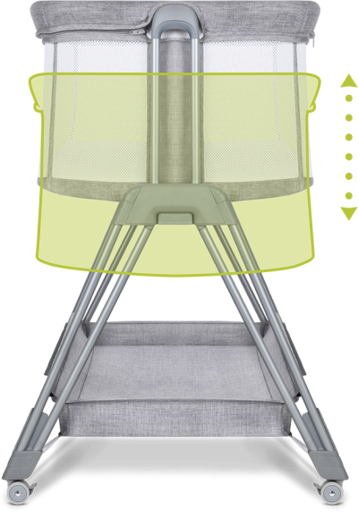 průhledná prodyšná síťovina 6 úrovní nastavení výšky nastavení sklonu boční otevírací strana snadné přemisťování postýlky díky 4 kolům se zámkem prostorný koš měkká tkanina snímatelný a pratelný potah i matrace