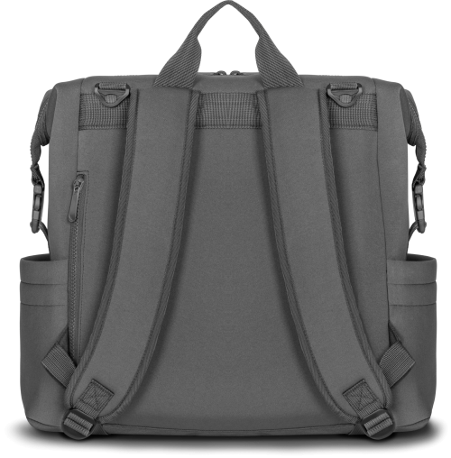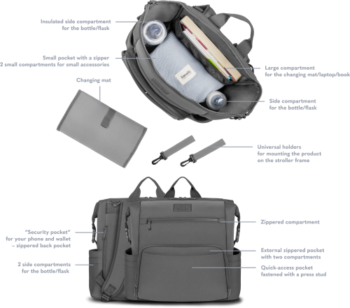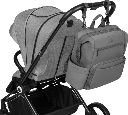 multifunkční batoh na záda, na kočárek nebo jako samostatný doplněk - kapsa na přebalování může sloužit na tablet nebo notebook vyrobeno z pevného nepromokavého neoprenu lze prát v pračce rozměry: 36 x 36 x 23 cm zapínání na zip 12 praktických kapes a přihrádek odmímatelné univerzální přezky pro připevnění k jákémukoli modelu kočárku pomocí přezek lze změnšit velikost batohu tak, aby se vešel i pod sedadlo v letadle
