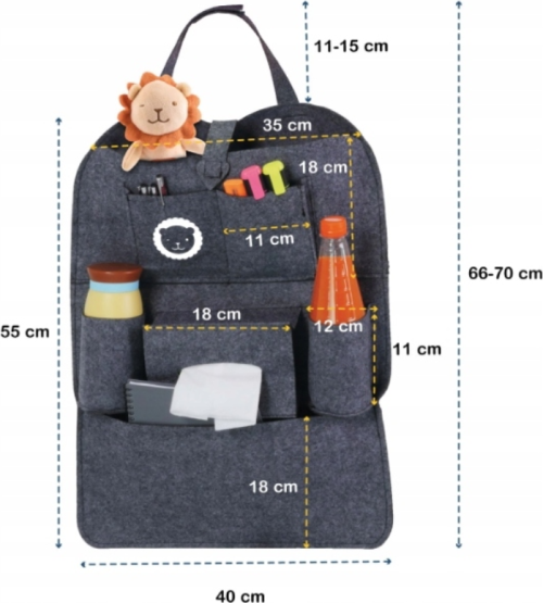 Je určen k montáži na zadní stranu předních sedadel automobilů. Lze připevnit shora pomocí pásků na suchý zip a zespodu pomocí elastických pásků se smyčkou. 7 praktických kapes: velká kapsa na suchý zip v horní části pro větší předměty, 2 svislé ploché kapsy uprostřed na menší předměty, 2 vnější hlubší a širší kapsy na nápoje, středová kapsa s otvorem např.pro kapesníky, velká kapsa ve spodní části. Univerzální barva. Pohodlný a praktický.