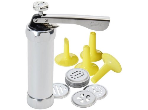 Lis na těsto - zdobičku využijete jak při pečení nejrůznějších sušenek, tak pro zdobení dortů či chlebíčků. Součástí je 20 různých kovových nástavců a 4 plastové zdobící nástavce. Jednoduchá manipulace pomocí pístu, dávkování těsta na cukroví pomocí krokovacího systému táhla pístu.