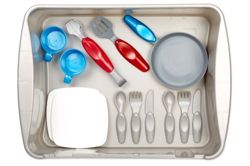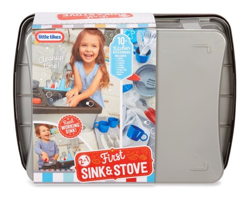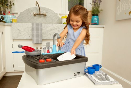 Little Tikes Můj první dřez je interaktivní hračka navržená tak, aby vypadala realisticky, takže děti mohou předstírat, že umývají nádobí stejně jako jejich rodiče.