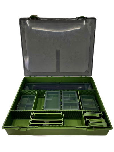 LK Baits CARP BOX MULTI – Velmi universální a praktický penál na celou rybářskou bižuterii, který obsahuje 6 menších různých krabiček a také penál na návazce. Rozměr 36x29x6cm (Olivová barva).