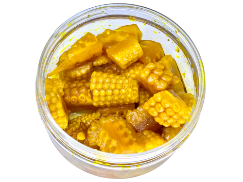 Nakládané kousky mladé kukuřice jsou velmi funkční nástrahou pro lov kaprovitých ryb. Kousky jsou vytažené z aromatických nálevů z aminokyselin, kde nějaký čas fermentovaly, tak aby byly pro ryby více atraktivní. Nástraha je zpracována tak, aby byla včetně dřevnaté části, která nástrahu vyvažuje a díky jednostrannému těžišti se i lépe zasékává. Co více, tato část dřevnaté nástrahy velmi dobře nasává naše speciální aroma a vylučuje ho pod vodou po velmi dlouhou dobu. Kapři budou také překvapeni jiným tvarem. Nástrahy se vyrábí ve třech velikostech S,M,L. Velikost S je pro feederové chytání, velikost M pro kaprové chytání a háčky č. 5- č.8 a Velká velikost L je určena pro lov kapitálních kaprů a háčky velikosti č.4 a více. Upozornění. Do nálevu používáme pouze přírodní konzervanty a někdy může docházet k silnější fermentaci, změně vůně, či barvy. Toto ovšem není na závadu. Jako podkladové krmení se nám nejvíce osvědčil partiklový mix, samostatná kukuřice a kukuřičné pelety.