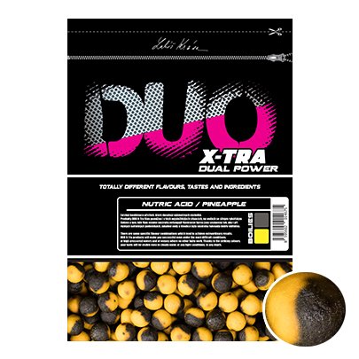 Nejlepší kombinace příchutí všech dob. Nutric Acid s Ananasem rybáři spolu používají už mnoho let s velkými úspěchy. Díky tomuto mixu jsou estery a jiné atraktanty do vody vylučovány postupně a po velmi dlouhou dobu. Pokud se zaměřujete na největší ryby v revíru, pak Nutric Acid/Pineapple je tou správnou volbou. Trvanlivé Boilies DUO X-Tra Vám pomůže i v těch nejsložitějších situacích, na vodách se silným rybářským tlakem a tam, kde Vám ostatní nástrahy nefungují! Kombinace našich nejúspěšnějších esencí a surovin, dělá z tohoto boilies nenapodobitelnou a velmi funkční návnadu/nástrahu. Kontrastní barvy jsou sestaveny tak, aby i při různých světelných podmínkách, zakalení vody a hloubce bylo boilies dobře viditelné.