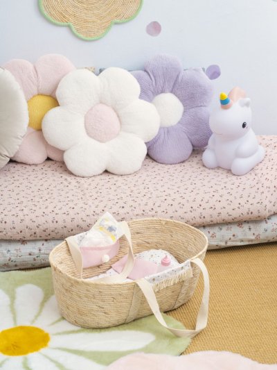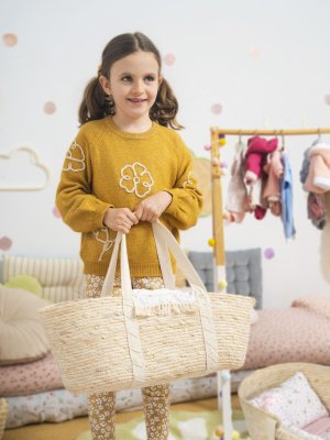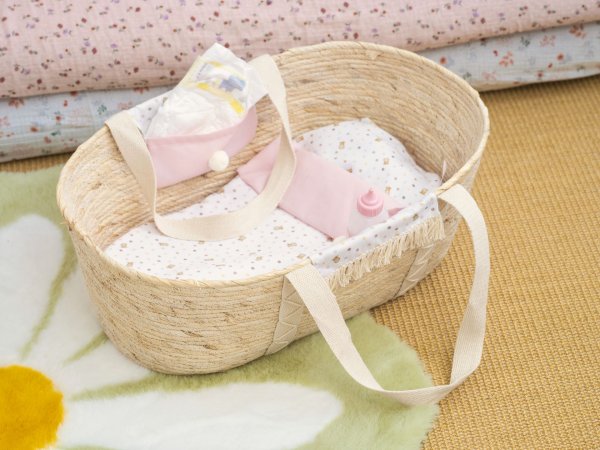 Mojžíšův košík Llorens pro panenky a miminka s povlečením, udělá radost každé malé mamince, která chce mít svou panenku či miminko vždy po ruce. Na obou stranách košíku jsou látkové kapsičky. Ozdobná peřinka s polštářem a matrací je nejenom krásným doplňkem tohoto přenosného košíku, ale také nepostradatelnou výbavou každé holčičky, která si hraje s panenkami. Hrajte si, procházejte se, houpejte a uspávejte, prostě si užívejte svou hru naplno. Košík je určený pro panenky velikosti 40-45 cm, ale velmi dobře může posloužit i jako místo pro uložení plyšáků či jiných hraček a zdobit tak dětský pokojík. Součástí košíku je také lahvička na hraní pro panenky plnitelná vodou a jednorázová plenka. Košík je ručně tkaný ze sušených kukuřičných listů. Jedná se tedy o ekologický výrobek, vyrobený ze 100% přírodních materiálů. Při zašpinění otřete vlhkým hadříkem a ihned osušte. Rozměry košíku: 51 x 31 x 20,4 cm (d x š x v). Vyrobeno ve Španělsku - Onil. Baleno v igelitovém obalu. Doporučený věk od 3 let.
