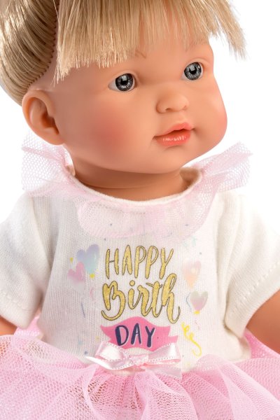 Panenka bez zvuku s vinylovým tělem a vlásky po celé hlavě. Ruce a nohy jsou k tělu přichyceny kloubem. Panenka je polohovací a může i sedět. Velikost panenky 28 cm. Ručně vyrobeno ve Španělsku, baleno v dárkové krabici. Doporučený věk od 3 let.