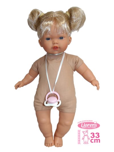 Mluvící a plačící panenka (po vyjmutí pojistky ihned funkční) s měkkým látkovým tělem a s vlásky po celé hlavě. Hlava a končetiny jsou vyrobené z kvalitního měkčeného vinylu. Po vytažení dudlíku z úst začne panenka říkat „mama“, „papa“ a vydávat reálný zvuk plačícího dítěte, který lze utišit opět magnetickým dudlíkem. Velikost panenky 33 cm. Ručně vyrobeno ve Španělsku, baleno v igelitovém obalu. Doporučený věk od 3 let. Tento model je bez oblečení a proto doporučujeme k panence dokoupit originální oblečení z nabídky Llorens pro panenky velikosti 33 cm. Součástí balení je 3 x knoflíková baterie LR44 s návodem na její výměnu. Baterie jsou spotřební zboží a proto jejich vybití není důvodem k reklamaci panenky.
