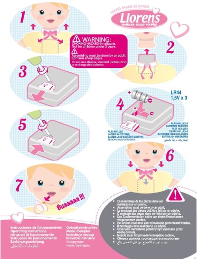 Mluvící a plačící panenka (po vyjmutí pojistky ihned funkční) s měkkým látkovým tělem a s vlásky po celé hlavě. Hlava a končetiny jsou vyrobené z kvalitního měkčeného vinylu. Po vytažení dudlíku z úst začne panenka říkat „mama“, „papa“ a vydávat reálný zvuk plačícího dítěte, který lze utišit opět magnetickým dudlíkem. Velikost panenky 38 cm. Ručně vyrobeno ve Španělsku, baleno v dárkové krabici. Doporučený věk od 3 let. K panence je možné dokoupit další originální oblečení z nabídky Llorens pro panenky velikosti 38 cm. Součástí balení je 3 x knoflíková baterie LR44 s návodem na její výměnu. Baterie jsou spotřební zboží a proto jejich vybití není důvodem k reklamaci panenky.