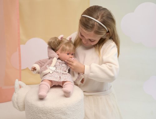 Mluvící a plačící panenka (po vyjmutí pojistky ihned funkční) s měkkým látkovým tělem a s vlásky po celé hlavě. Hlava a končetiny jsou vyrobené z kvalitního měkčeného vinylu. Po vytažení dudlíku z úst začne panenka říkat „mama“, „papa“ a vydávat reálný zvuk plačícího dítěte, který lze utišit opět magnetickým dudlíkem. Velikost panenky 42 cm. Ručně vyrobeno ve Španělsku, baleno v dárkové krabici. Doporučený věk od 3 let. K panence je možné dokoupit další originální oblečení z nabídky Llorens pro panenky velikosti 42 cm. Součástí balení je 3 x knoflíková baterie LR44 s návodem na její výměnu. Baterie jsou spotřební zboží a proto jejich vybití není důvodem k reklamaci panenky.