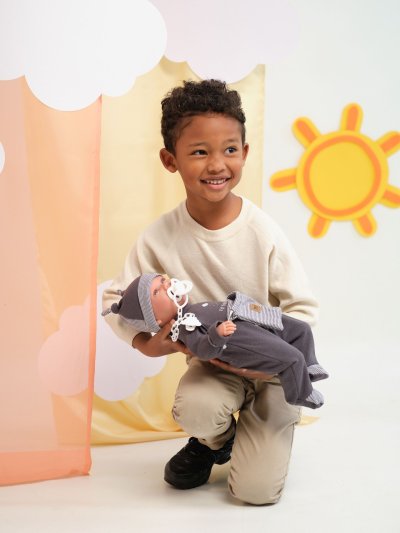 Mluvící miminko s měkkým látkovým tělem, které se po zatlačení na hrudník začne smát a říkat „mama“, „papa“. Ruce a nohy jsou k tělu přichyceny kloubem. Miminko je polohovací a může i sedět. Dudlík v balení slouží pouze jako doplněk. Velikost 42 cm. Ručně vyrobeno ve Španělsku, baleno v dárkové krabici. Doporučený věk od 3 let. K miminku je možné dokoupit další originální oblečení z nabídky Llorens pro miminka NEW BORN velikosti 40-42 cm nebo 43-45 cm. Součástí balení je 3 x knoflíková baterie LR44 s návodem na její výměnu. Baterie jsou spotřební zboží a proto jejich vybití není důvodem k reklamaci panenky.