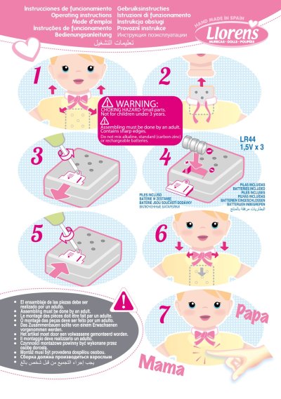 Mluvící miminko s měkkým látkovým tělem, které po zatlačení na hrudník začne říkat „mama“, „papa“ a vydávat reálný zvuk plačícího miminka. Ruce a nohy jsou k tělu přichyceny kloubem. Miminko je polohovací a může i sedět. Dudlík v balení slouží pouze jako doplněk. Velikost 42 cm. Ručně vyrobeno ve Španělsku, baleno v dárkové krabici. Doporučený věk od 3 let. K miminku je možné dokoupit další originální oblečení z nabídky Llorens pro miminka NEW BORN velikosti 40-42 cm nebo 43-45 cm. Součástí balení je 3 x knoflíková baterie LR44 s návodem na její výměnu. Baterie jsou spotřební zboží a proto jejich vybití není důvodem k reklamaci panenky.