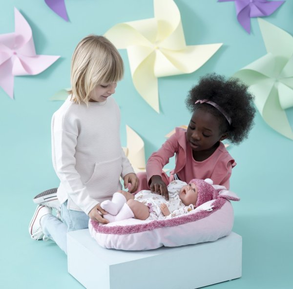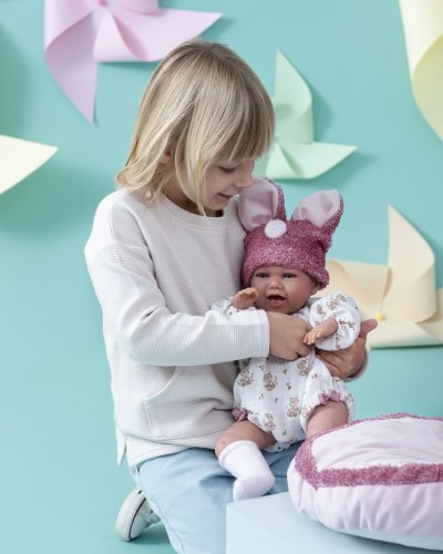 Mluvící miminko s měkkým látkovým tělem, které se po zatlačení na hrudník začne smát a říkat „mama“, „papa“. Ruce a nohy jsou k tělu přichyceny kloubem. Miminko je polohovací a může i sedět. Dudlík v balení slouží pouze jako doplněk. Velikost 42 cm. Ručně vyrobeno ve Španělsku, baleno v dárkové krabici. Doporučený věk od 3 let. K miminku je možné dokoupit další originální oblečení z nabídky Llorens pro miminka NEW BORN velikosti 40-42 cm nebo 43-45 cm. Součástí balení je 3 x knoflíková baterie LR44 s návodem na její výměnu. Baterie jsou spotřební zboží a proto jejich vybití není důvodem k reklamaci panenky.