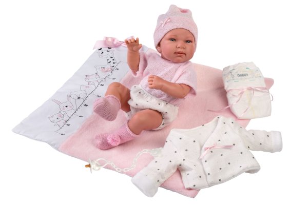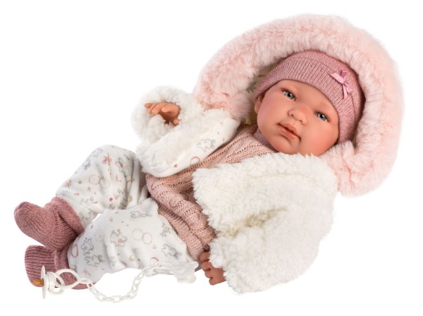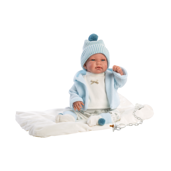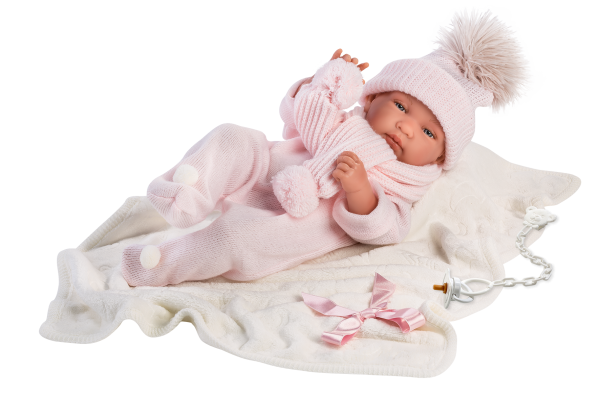 Mluvící miminko s měkkým látkovým tělem, které po zatlačení na hrudník začne říkat „mama“, „papa“ a vydávat reálný zvuk plačícího miminka. Ruce a nohy jsou k tělu přichyceny kloubem. Miminko je polohovací a může i sedět. Tento model je bez oblečení a proto doporučujeme k panence dokoupit originální oblečení z nabídky Llorens pro miminka NEW BORN velikosti 43-45 cm.Dudlík v balení slouží pouze jako doplněk. Velikost 44 cm. Ručně vyrobeno ve Španělsku, baleno v igelitovém obalu. Doporučený věk od 3 let. Součástí balení je 3 x knoflíková baterie LR44 s návodem na její výměnu. Baterie jsou spotřební zboží a proto jejich vybití není důvodem k reklamaci panenky.