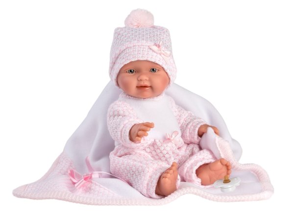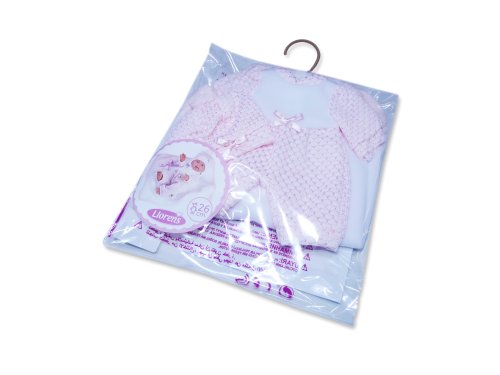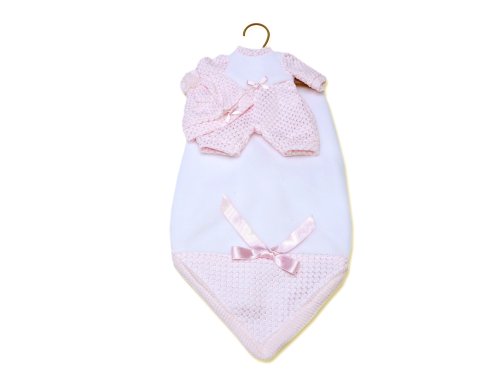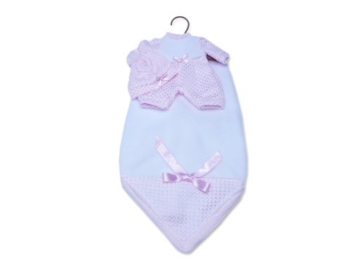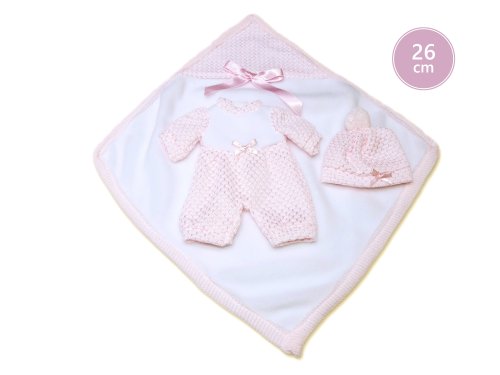 2dílný obleček s ozdobnou dečkou a mašličkou pro panenku miminko NEW BORN Llorens velikosti 26 cm. Vyrobeno ve Španělsku, baleno v igelitovém obalu s plastovým nebo kartonovým ramínkem. Doporučený věk od 3 let.