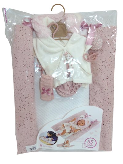 3dílný obleček s ozdobnou přebalovací podložkou a bambulkou pro panenku miminko NEW BORN Llorens velikosti 35-36 cm. Vyrobeno ručně ve Španělsku, baleno v igelitovém obalu s plastovým ramínkem. Doporučený věk od 3 let.