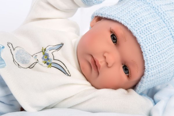 3dílný obleček s polštářem, využitelným jako podložka, pro panenku miminko NEW BORN Llorens velikosti 35-36 cm. Vyrobeno ve Španělsku, baleno v igelitovém obalu s plastovým nebo kartonovým ramínkem. Doporučený věk od 3 let.
