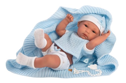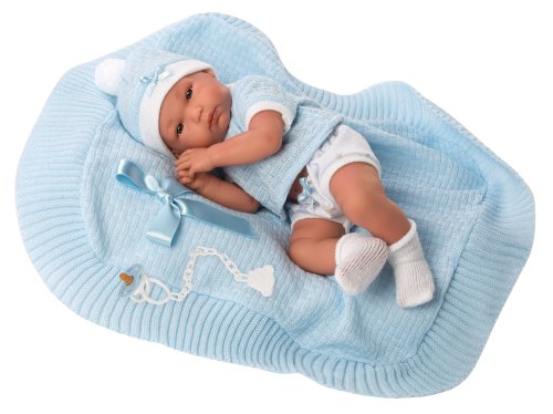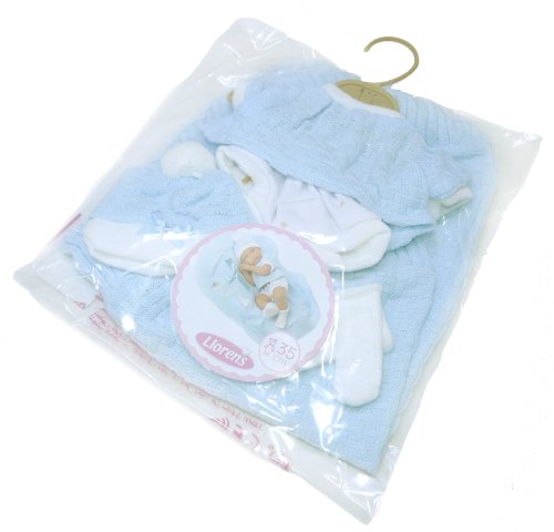 4dílný obleček s ozdobnou dečkou s mašličkou pro panenku miminko NEW BORN Llorens velikosti 35-36 cm. Vyrobeno ve Španělsku, baleno v igelitovém obalu s plastovým nebo kartonovým ramínkem. Doporučený věk od 3 let.