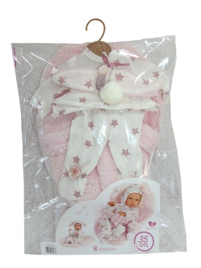 2dílný obleček s motivem zajíčka s měkkoučkou funkční podložkou s tříbodovým pásovým uchycením pro panenku miminko NEW BORN Llorens velikosti 35-36 cm. Vyrobeno ručně ve Španělsku, baleno v igelitovém obalu s plastovým ramínkem. Doporučený věk od 3 let.