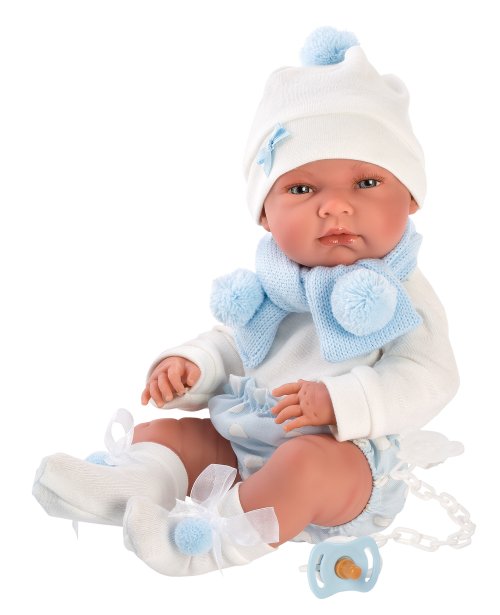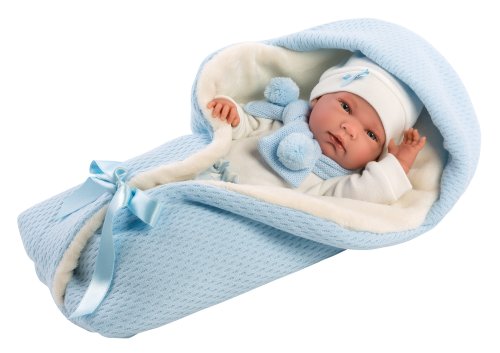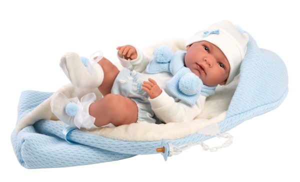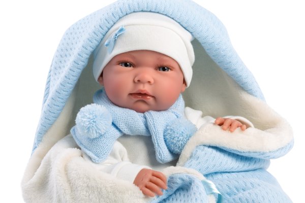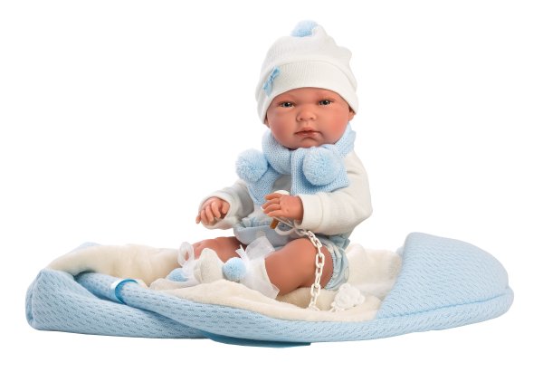 5dílný obleček s rychlozavinovací dekou s kapucí pro panenku miminko NEW BORN Llorens velikosti 40-42 cm. Vyrobeno ručně ve Španělsku, baleno v igelitovém obalu s plastovým ramínkem. Doporučený věk od 3 let.