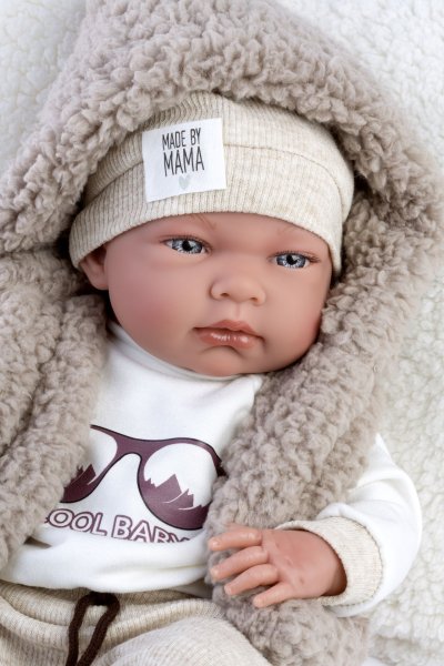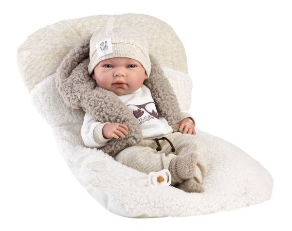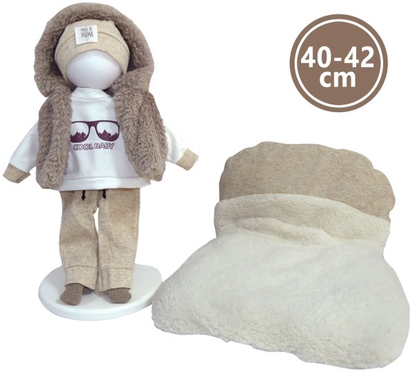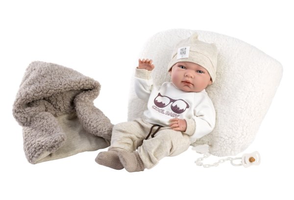 5dílný obleček s oboustranným polštářem využitelným jako podložka pro panenku miminko NEW BORN Llorens velikosti 40-42 cm. Vyrobeno ručně ve Španělsku, baleno v igelitovém obalu s plastovým ramínkem. Doporučený věk od 3 let.