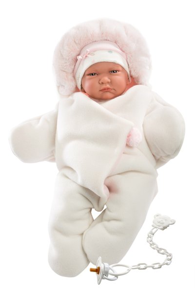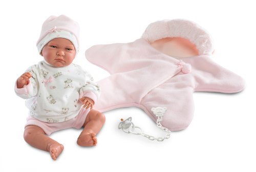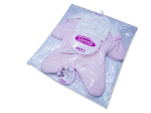 3dílný obleček s oboustranným fleecovým overalem ve tvaru hvězdy pro panenku miminko NEW BORN Llorens velikosti 40-42 cm. Vyrobeno ve Španělsku, baleno v igelitovém obalu s plastovým nebo kartonovým ramínkem. Doporučený věk od 3 let.