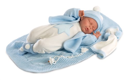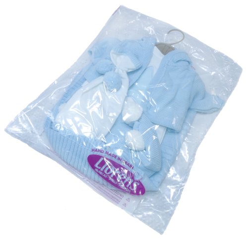 4dílný obleček s ozdobnou dečkou a muchlacím kapesníčkem s bambulkami pro panenku miminko NEW BORN Llorens velikosti 40-42 cm. Vyrobeno ve Španělsku, baleno v igelitovém obalu s plastovým nebo kartonovým ramínkem. Doporučený věk od 3 let.