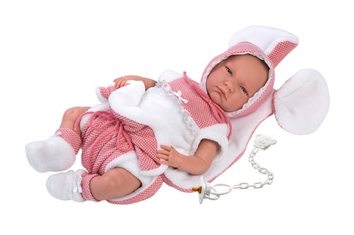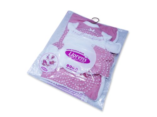 3dílný obleček s ozdobnou podložkou s ouškama pro panenku miminko NEW BORN Llorens velikosti 40-42 cm. Vyrobeno ve Španělsku, baleno v igelitovém obalu s plastovým nebo kartonovým ramínkem. Doporučený věk od 3 let.