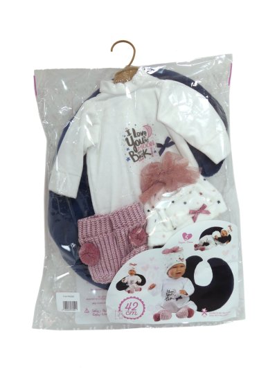 3dílný obleček s kojícím polštářem pro panenku miminko NEW BORN Llorens velikosti 40-42 cm. Vyrobeno ručně ve Španělsku, baleno v igelitovém obalu s plastovým ramínkem. Doporučený věk od 3 let.