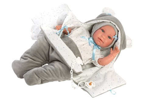 2dílný obleček se sametovou rychlozavinovačkou do autosedačky a ozdobným kapesníčkem pro panenku miminko NEW BORN Llorens velikosti 40-42 cm. Vyrobeno ve Španělsku, baleno v igelitovém obalu s plastovým nebo kartonovým ramínkem. Doporučený věk od 3 let.