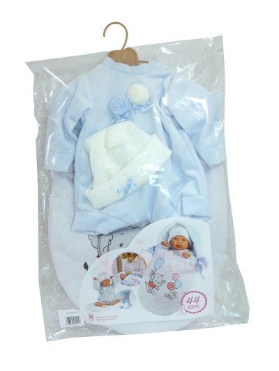 2dílný obleček s fusakem pro panenku miminko NEW BORN Llorens velikosti 43-44 cm. Vyrobeno ručně ve Španělsku, baleno v igelitovém obalu s plastovým ramínkem. Doporučený věk od 3 let.