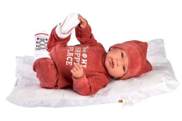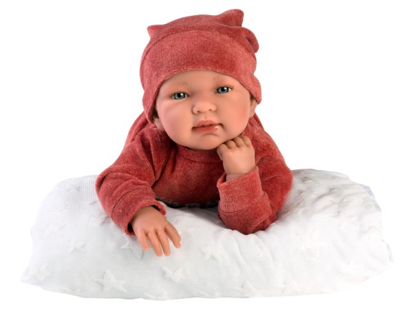 3dílný obleček s polštářem využitelným jako podložka a muchlacím kapesníčkem s bambulkou pro panenku miminko NEW BORN Llorens velikosti 43-44 cm. Vyrobeno ve Španělsku, baleno v igelitovém obalu s plastovým nebo kartonovým ramínkem. Doporučený věk od 3 let.