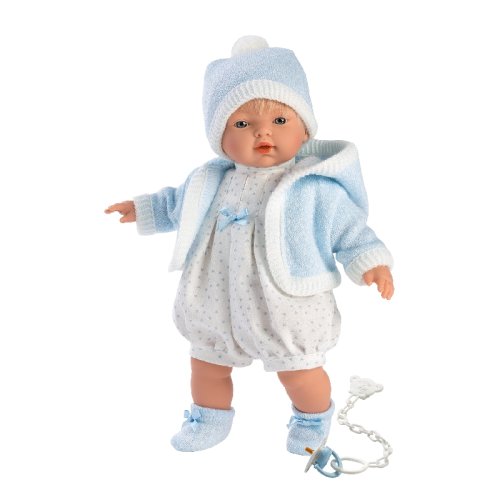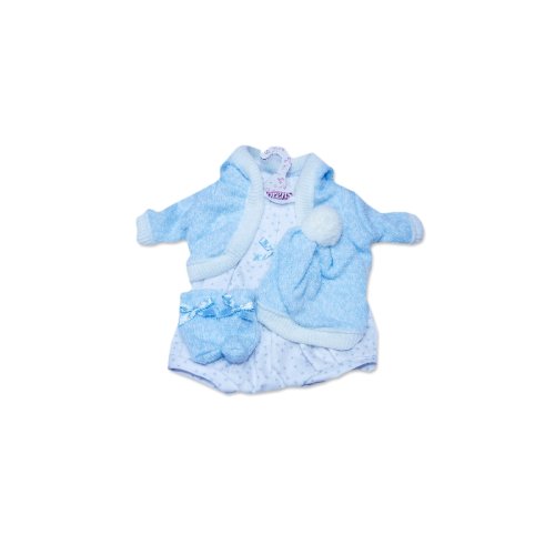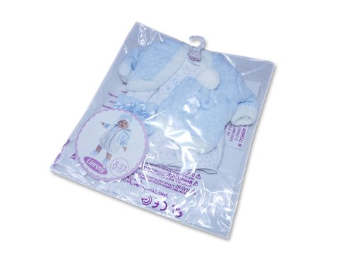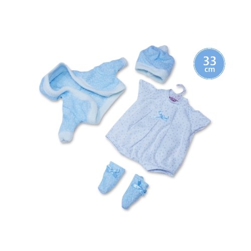 4dílný obleček pro panenku Llorens velikosti 33 cm. Vyrobeno ve Španělsku, baleno v igelitovém obalu s plastovým nebo kartonovým ramínkem. Doporučený věk od 3 let.