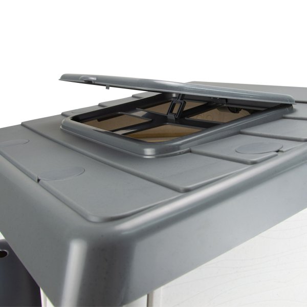 4) Vyklápěcí zadní stěna, která poskytuje vašemu mazlíčkovi mnohem více prostoru a pohodlí a zajištuje v letním období možnost udělat z uzavřeného domečku vzdušný otevřený altánek. Stěna je uzavíratelná a má zabezpečení proti náhodnému otevření. Tento sklopný systém otevírání zadní stěny usnadňuje také přístup dovnitř pro lepší úklid. Z tohoto důvodu má modulární podlaha domku SMARTKAVE na své základně drážky pro odvod vody.