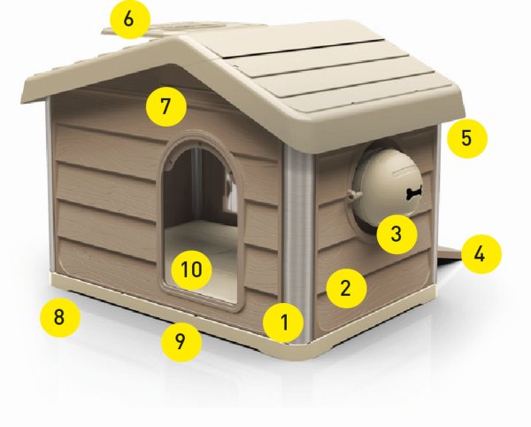 Domeček tvoří 6 hlavních modulárních dílů: stěna s vchodem, otevírací zadní stěna, stěna s dávkovačem krmiva, stěna bez otvoru, podlaha s malými drážkami, které umožňují lepší odvod vody směrem ven při mytí, sedlová střecha plus 2 malé trojúhelníkové části tvořící štíty střechy, 4 konstrukční tyče a spojovací elementy.