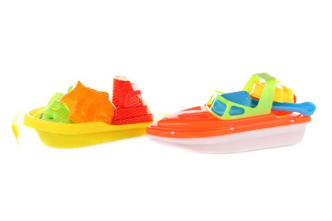 Plastová lodička s hračkami na písek. Obsahuje hrabičky, lopatku a 2 bábovky. Velikost loďky cca 27 x 10,5 cm (dle druhu). Věk 3+