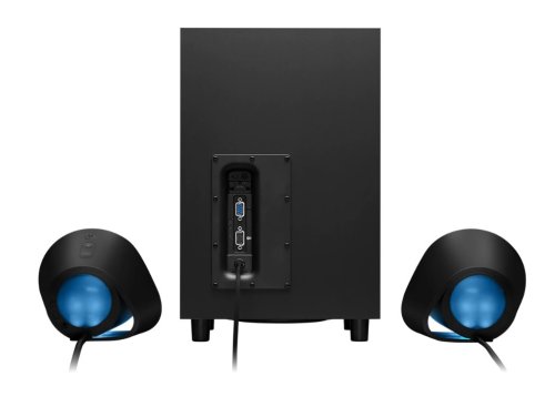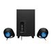 Reproduktorový systém 2.1 s širokospektrým podsvícením LIGHTSYNC RGB reaguje na herní akce a zvuk. Poziční prostorový zvuk DTS:X Ultra vychází z výbušného subwooferu s otvorem vyzařujícím dolů a dvou satelitních reproduktorů s širokoúhlými měniči.