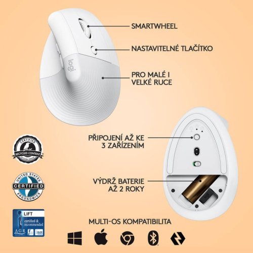 Myš Logitech Lift se může pochlubit řadou funkcí, které vylepší váš pracovní prostor a pomohou vám být efektivnější. Rychlé a přesné projíždění obsahem zajistí kolečko SmartWheel, o přizpůsobení myši na maximum se postará jednoduchý software Logi Options+, s jehož pomocí snadno přiřadíte funkce 4 snadno přístupným tlačítkům – od ztlumení mikrofonu po převádění hlasu na text s OSDictation. Funkce Easy Switch pak zajistí snadné přepínání mezi až 3 zařízeními, mezi kterými lze dokonce přesouvat soubory pomocí technologie Logitech Flow.