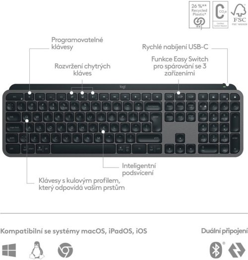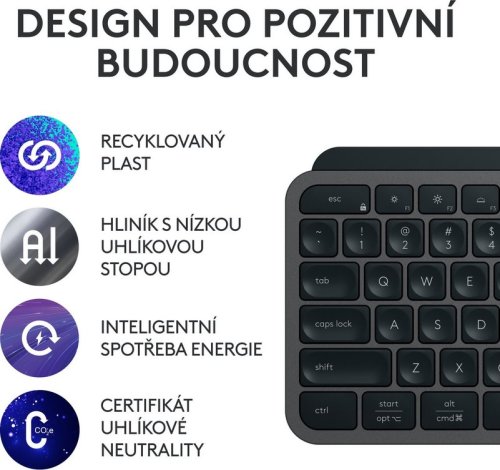 Logitech myslí na naši budoucnost, proto je klávesnice vyrobena z recyklovaného plastu, používá hliník s nízkou uhlíkovou stopou a má balení šetrné k přírodě. Výsledkem je certifikát uhlíkové neutrality.
