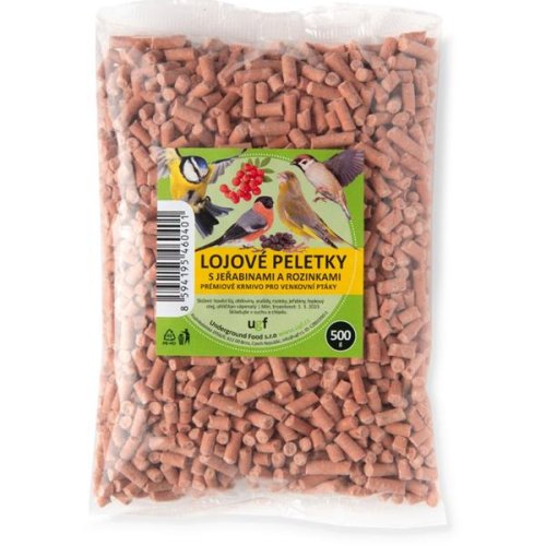 Lojové peletky s jeřabinami a rozinkami jsou prémiové krmivo pro venkovní ptáky. Obsahují kvalitní hovězí lůj, obiloviny, arašídy, jeřabiny a rozinky. Pro ptáky jsou velmi atraktivní a přilákají do zahrady různé druhy divokých ptáků. Mohou se podávat samostatně v krmítcích nebo na zemi. Skvěle také doplňují různé semínkové směsi. Peletky jsou obohaceny oříšky, rozinkami a jeřabinami, které jsou přirozenou potravou volně žijících ptáků. Lojové peletky lze krmit celoročně a představují snadno stravitelný zdroj energie pro dokrmování ptáků v zimě a v období krmení mláďat. Složení: Hovězí lůj, obiloviny, arašídy, rozinky, jeřabiny, řepkový olej, uhličitan vápenatý. Skladujte v suchu a chladnu.