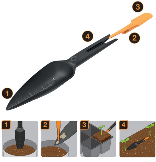 Lehká a odolná lopatka v sobě obsahuje čtyři základní nástroje pro výsadbu osiva. Obsahuje: lžičku na osivo, ostrý hrot, rozšiřující lopatku a měřítko - vše integrováno do jednoho dvoudílného nástroje. Dobře čitelné měřítko s anglickou a metrickou stupnicí je vytlačené do povrchu lopatky a používáním se neporuší ani nezmizí. Lehké a velmi pevné provedení, odolává povětrnostním vlivům, nerezne. Délka: 33 cm, šířka: 2,2 cm. Hmotnost: 0,06 kg.