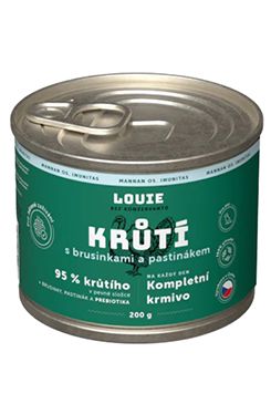 Kompletní krmivo bez obilnin pro psy každého věku i plemene, krůtí s brusinkami a pastinákem. Nabízí Vašemu miláčkovi možnost stravy z kvalitního masa (95 % v pevné složce). Pro podporu peristaltiky střev a simulaci minoritní rostlinné složky v potravě psů slouží příměs brusinek, pastináku.
