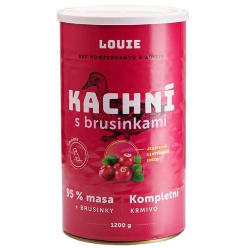 Složení: kachní maso, vývar, změkčené kachní kosti, brusinky, minerály a vitamíny. Analytické složky: hrubý protein 12,9 %, hrubý tuk 13 %, hrubý popel 1 %, hrubá vláknina 0,1 %, vlhkost 73 %. Doplňkové látky na 1 kg: vitamín A 11 500 m.j., vitamín D3 900 m.j., vitamín E 150 mg, vitamín B1 0,6 mg, vitamín B2 2,2 mg vitamín B6 0,6 mg, niacinamid 7,5 mg, kyselina listová 0,3 mg, cholinchlorid 350 mg, železo 45 mg, zinek 50 mg, mangan 22,8 mg, jód 0,4 mg, selen 0,15 mg. Dávkování: